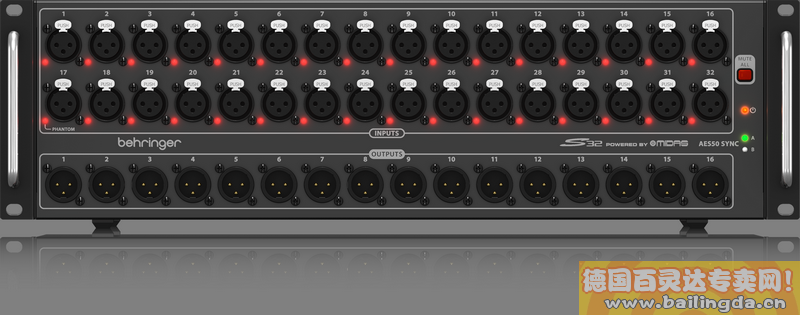 “当作为完整X32系统的一部分使用时,可以通过调音台的内置双AES50端口连接两个S32舞台箱,可连接多达64个远程话筒/线路输入,32个平衡输出和超棒的POWERPLAY P-16 个人监听系统 - 可以通过CAT5向舞台上的每位音乐家提供多达16个独立的监听混音。 当32个输入不足时,S32 Stage Box也可以与S16或SD16级联,以便在一条CAT5线路上充分利用AES50 SuperMAC网络的48通道双向容量。 我们还包括2个光学ADAT输出和2个AES-3(AES / EBU)立体声输出,用于数字连接到外部设备,如PA系统控制器。 S32还具有方便的USB端口,可通过PC进行系统更新 - 以及用于照明系统和声音模块控制的MIDI I / O.