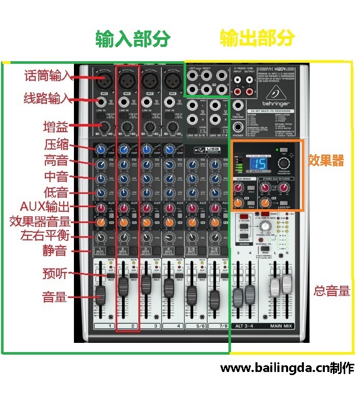 - 产品描述:4路单声道输入,2组立体声输入(4通道),内置16种混响,模拟调音台