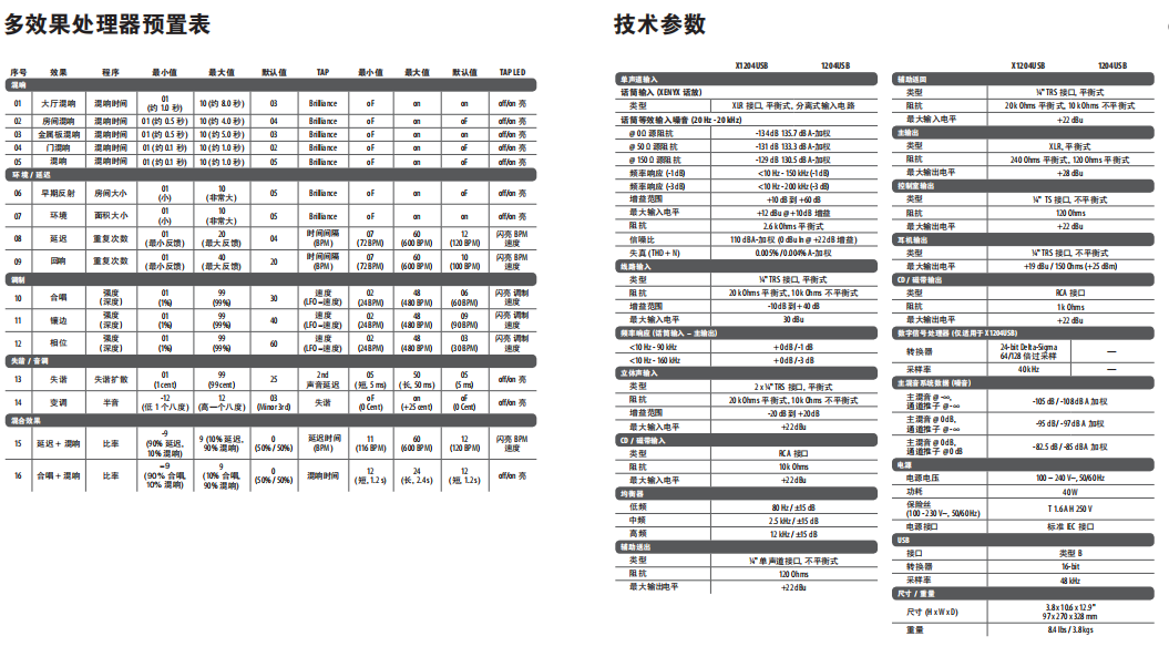 - 录音室级别的24比特效果处理器,配有100套音质优美的预置。如:混响,延时,镶边,合唱,高音移动等许多其它多重效果