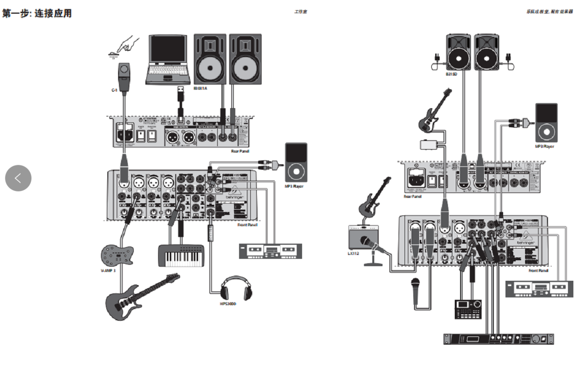 - 配有USB /音频界面,可直接与电脑连接。音频录音和编辑软体可在www.behringer.com免费下载