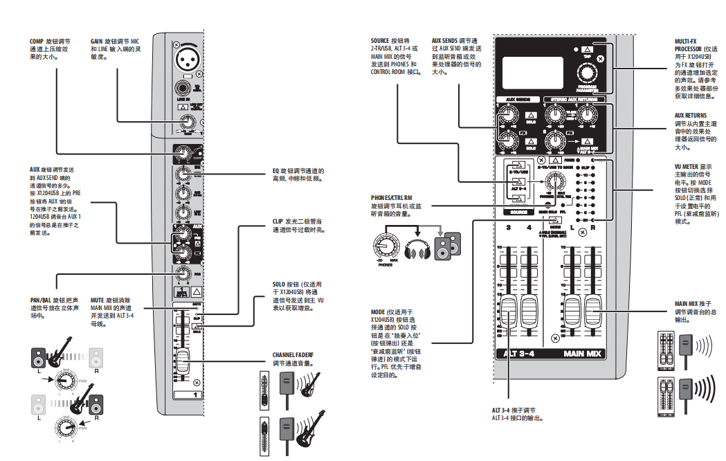 - 所有声道都配有峰值二极发光管,静音/ alt开关(3/4声道),还有单声道信号和推杆前置监听功能